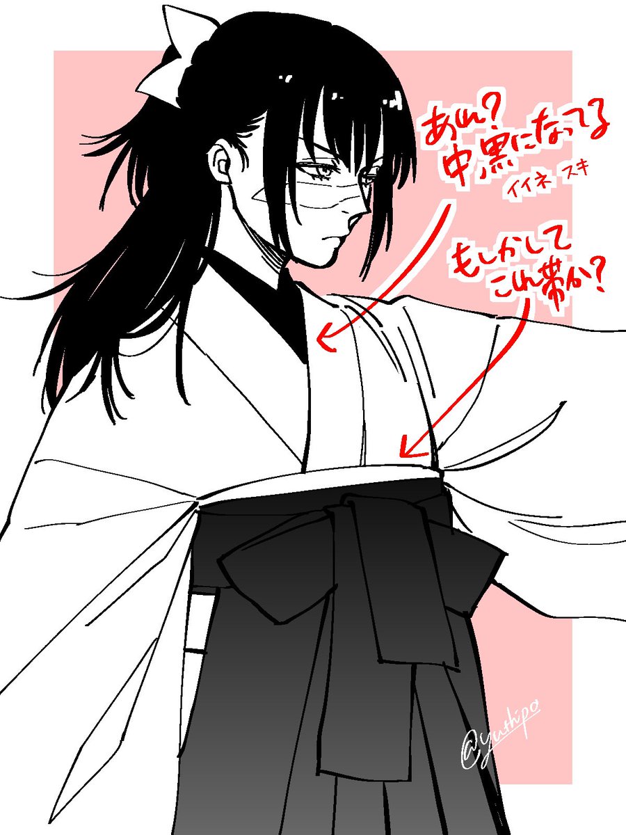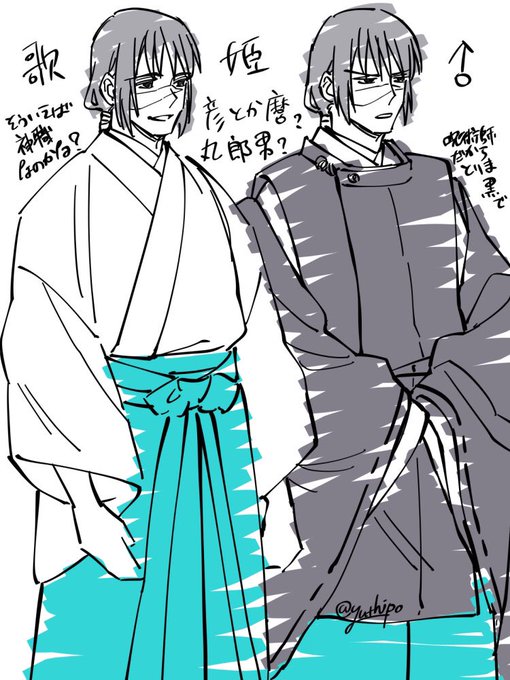 歌先生♂ 袴の色赤から青に反転しようと思ったけどもし神職だったら袴の色は階級を表してて歌先生くらいの歳なら青でも良さげだけど当主としては紫か白の方がぽい 男の顔に傷だと普通になってしまうな…