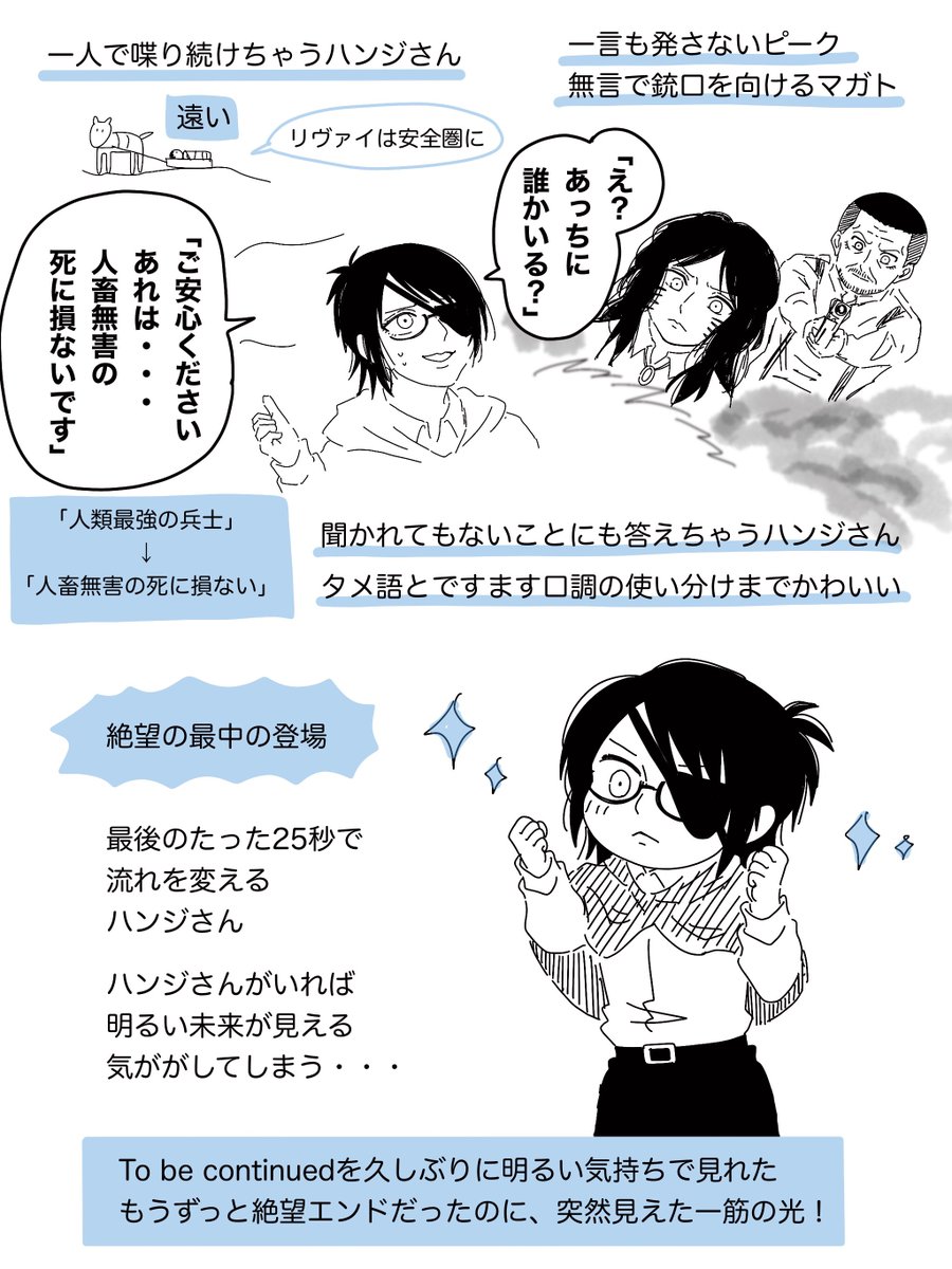 アニメ82話最高でした! ハンジさん登場シーンの好きなとこ。 本誌125話読んだ時のあの興奮をもう一度味わえるなんて・・・