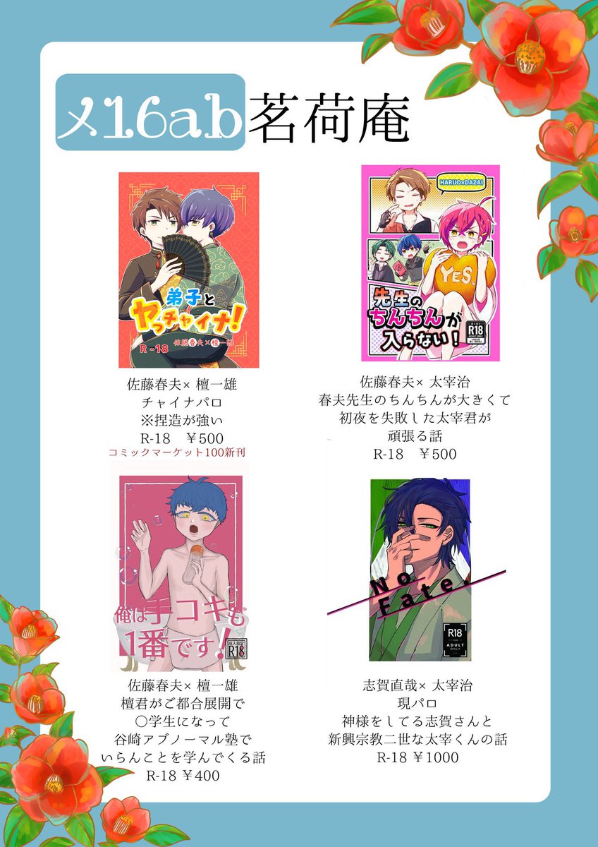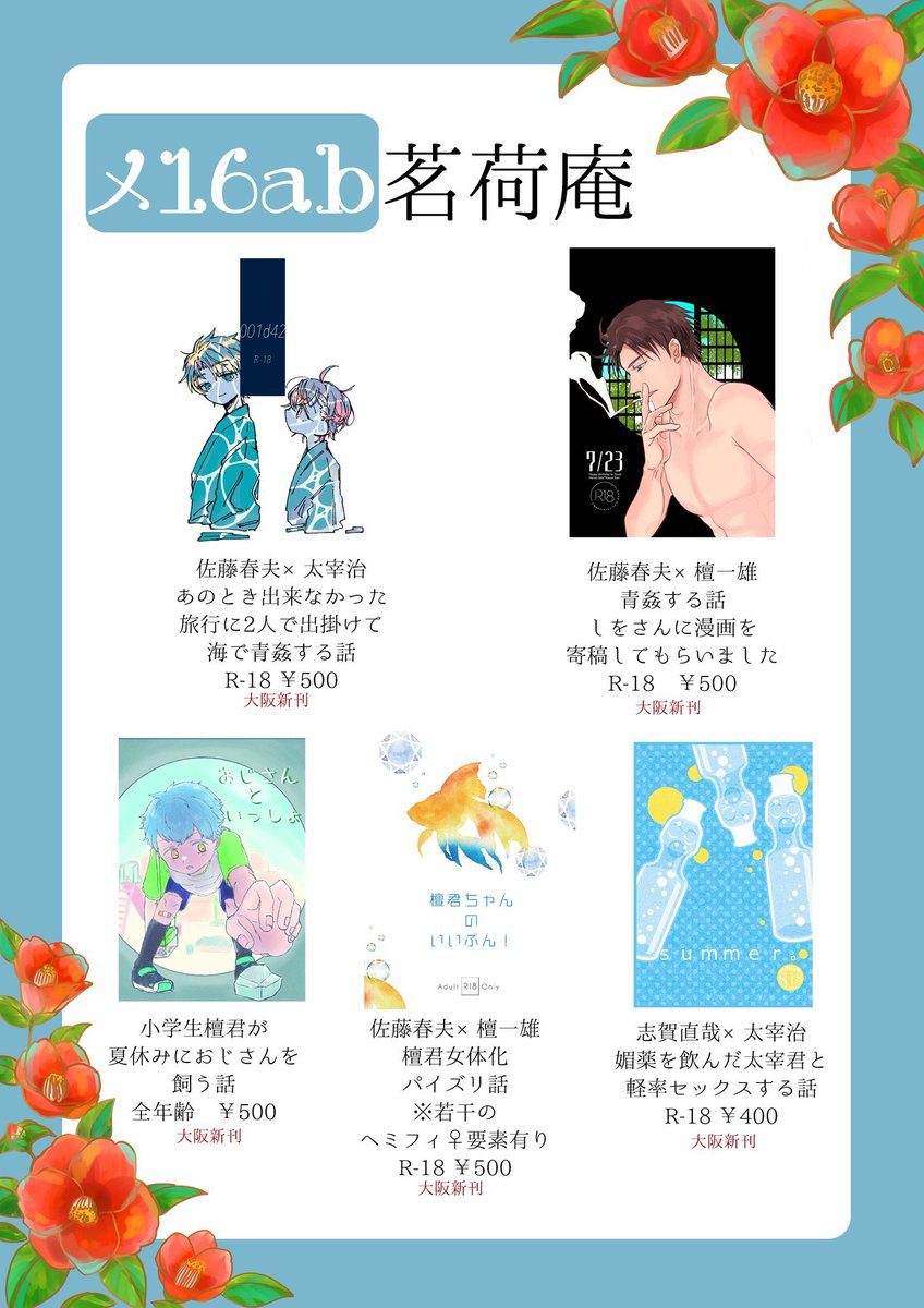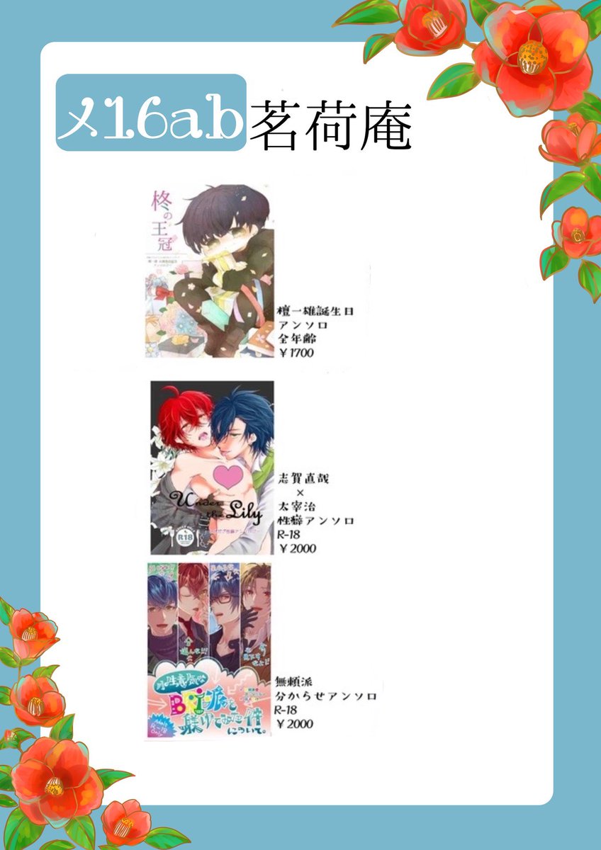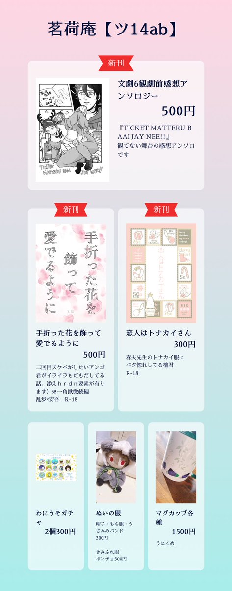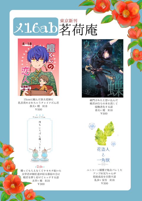 35 38 或図書24 メ16ab 茗荷庵お品書き! 新刊は はるだん×2 だざだん 乱安の4冊!! その他 わにうそガチャ第一弾と第二段 コミケ新刊、インテ新刊、アンソロ各種を持ち込みます。 委託で、 るあんさん(@aromapotR )のあんだざと室織 蝶凛さん(@hina_chiyori )の写真集を取り扱います 22/08/26 22:56