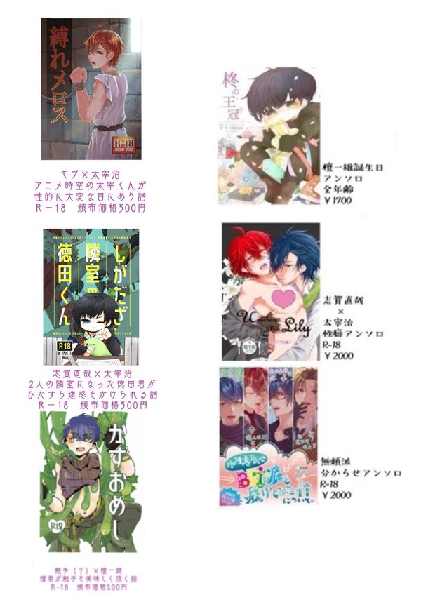 或図書24 メ16ab 茗荷庵お品書き! 新刊は はるだん×2 だざだん 乱安の4冊!! その他 わにうそガチャ第一弾と第二段 コミケ新刊、インテ新刊、アンソロ各種を持ち込みます。 委託で、 るあんさん(@aromapotR )のあんだざと室織 蝶凛さん(@hina_chiyori )の写真集を取り扱います