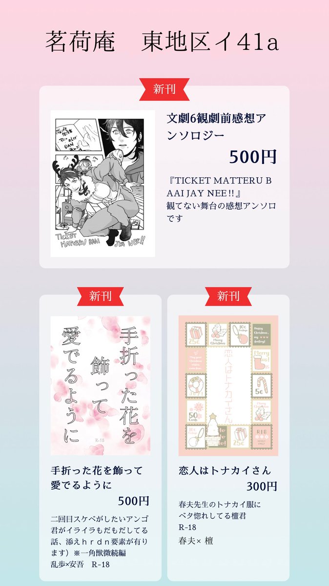 冬コミお品書きです!!!!!【東地区イ41a】 12月或図新刊 観劇前アンソロとhrdn、乱安本あります!!! マグカップ、ぬいのネックレス、ぬいの服あります🙋♀️🙋♀️🙋♀️