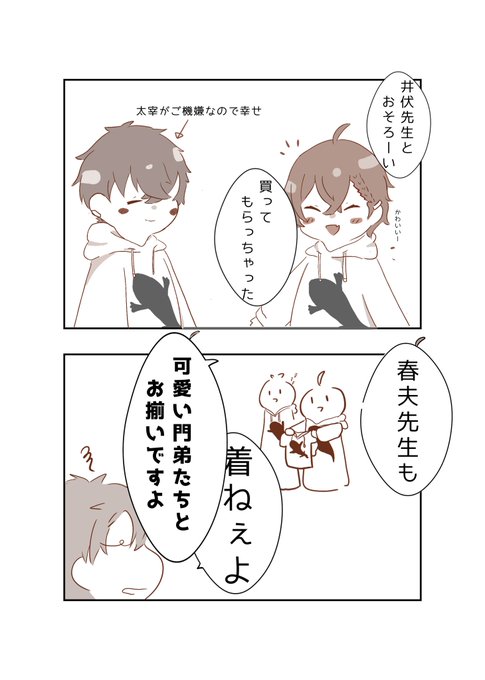 イブセ先生のオオサンショウウオパーカー可愛いからお揃いで着て欲しい。(この後ハルオ君もお揃いしてくれる)
