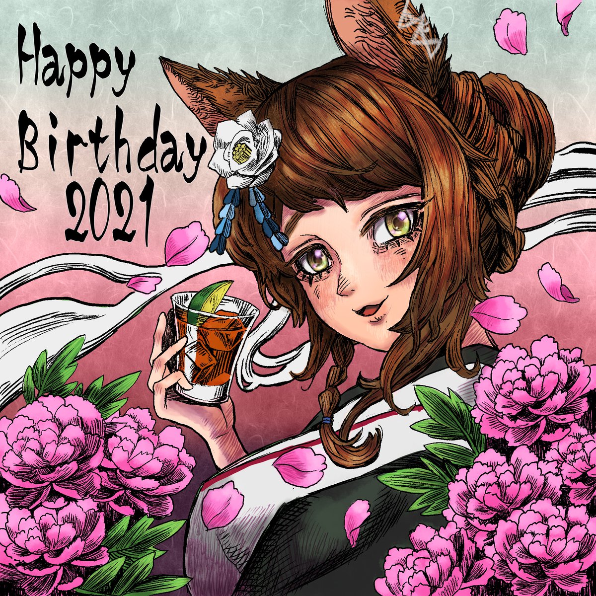 お誕生日おめでとうございます!🎉🦊 お酒は誕生酒のチョコレートギムレット🍸(イラストだと伝わりにくい😅) 酒言葉は「人を助け思いやるピュアな心の持ち主」 #恋フミ #ふみさんろくじゅうきゅうさい #NIJIArt