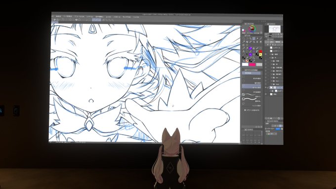 どうせVRChatで作業するなら、自分の作業画面を同じワールドにいるフレンドに配信してライブドローイングすればいいじゃんと気づいた図。