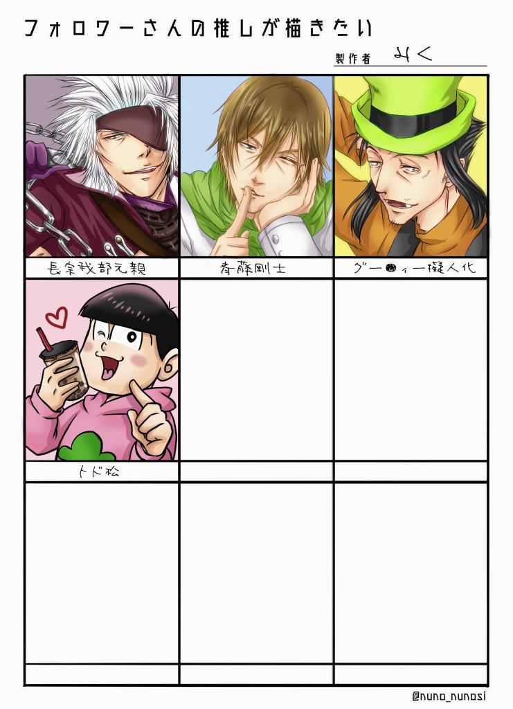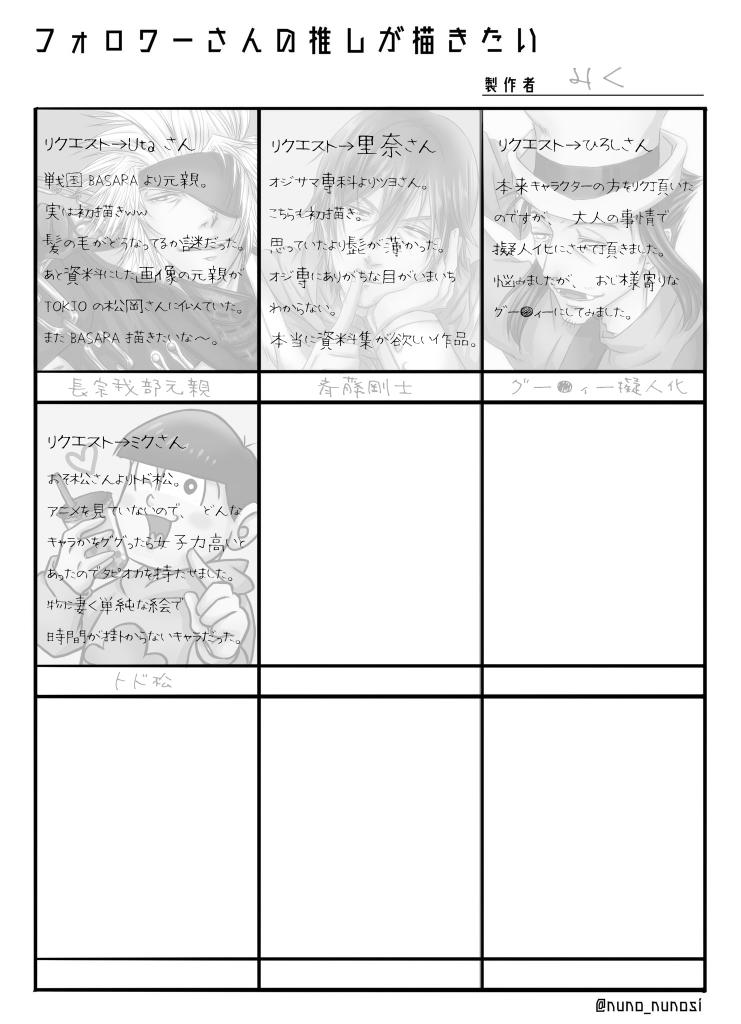 #フォロワーさんの推しが描きたい Utaさん @Utaoekaki25 里奈さん @hadurina ひろしさん @oohiromaa_52 ミク🍮︎💕︎さん @039chaso リク頂いたキャラ出来上がりましたー。リクありがとうございました♥ あと5枠空きがあるので、もしリクがある方いればどぞ。