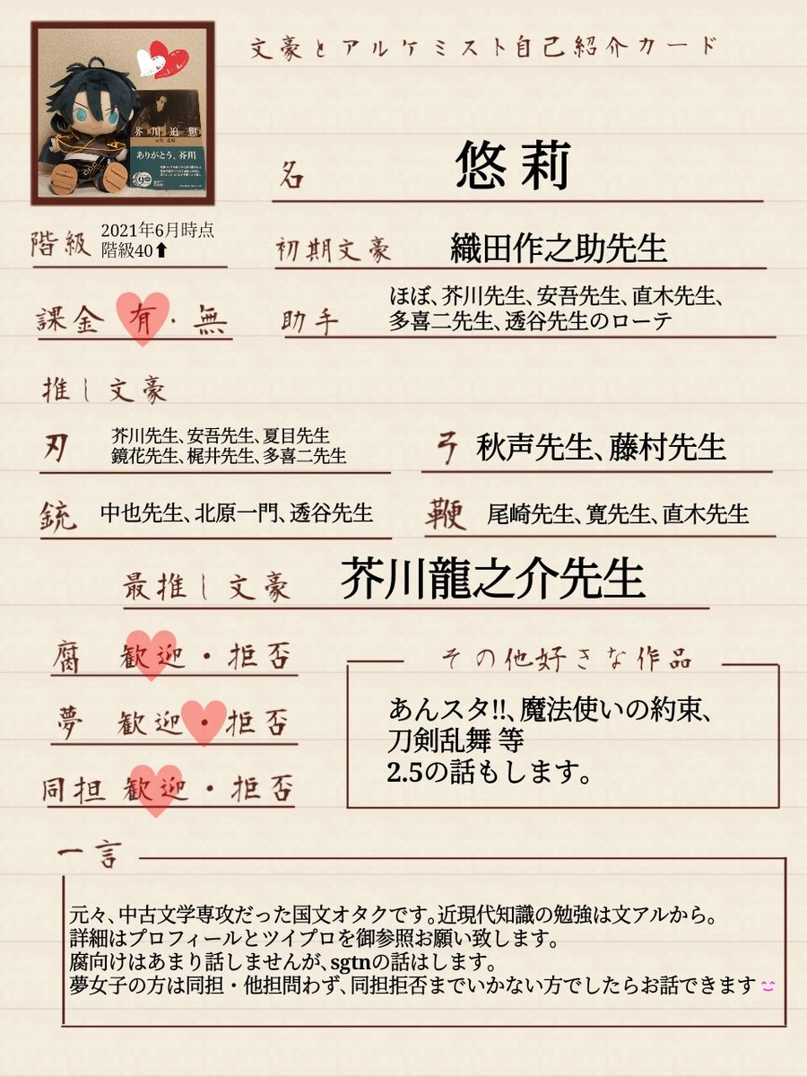 #文アル好きさんと繋がりたい プロフィール更新したのでそっと。 ゲーム始めて半年程です。文アニと文劇2まで履修済みです(*´˘`*)♥ コスプレはまだしてませんが、自分用にアクセサリーとか作ったりお店で作って頂いたりしてます。