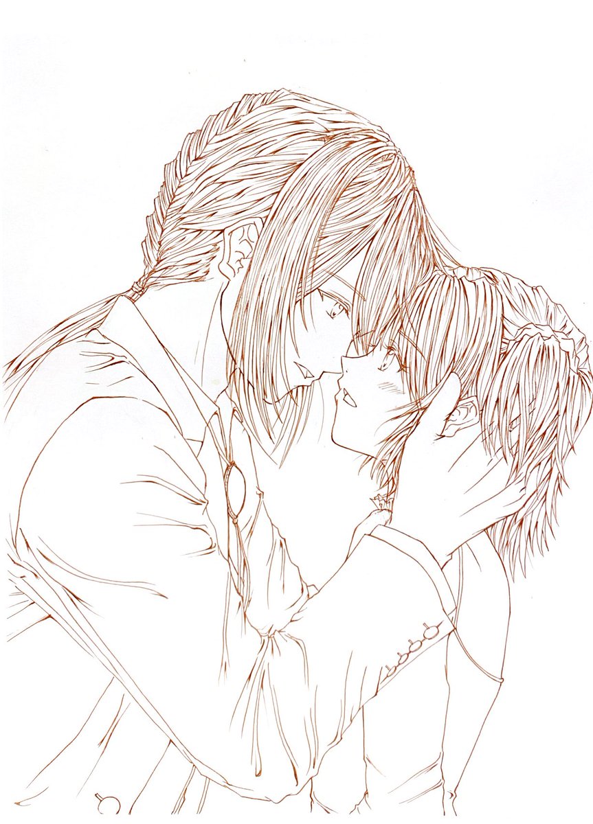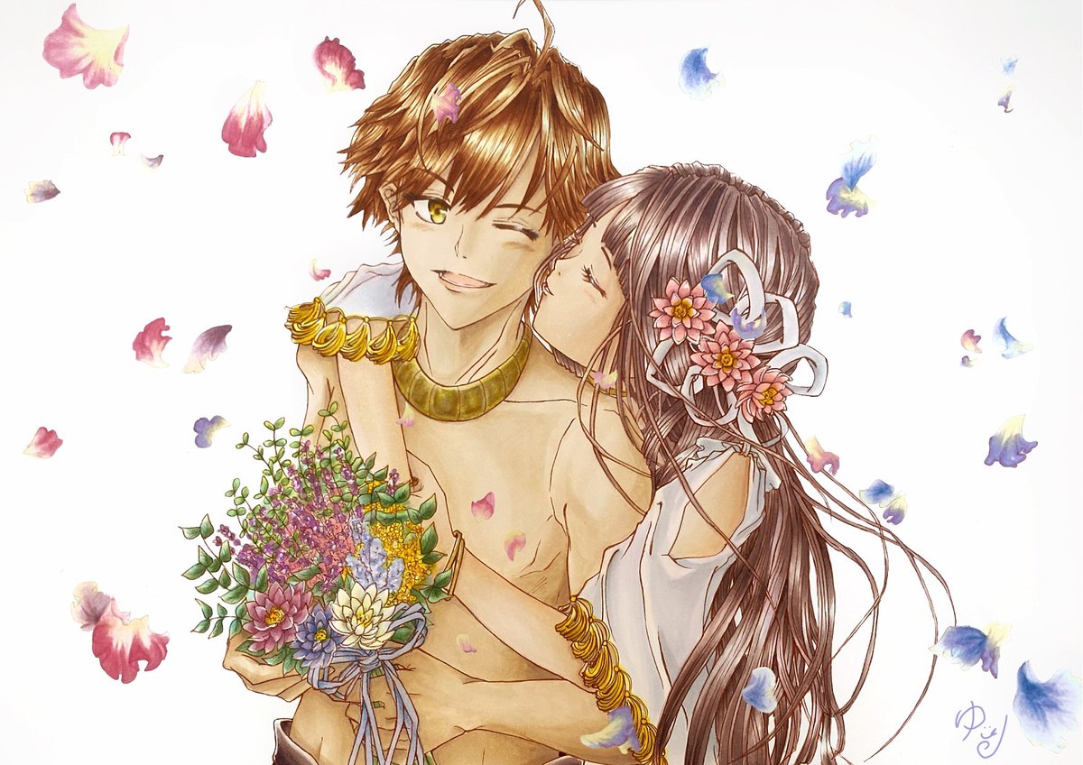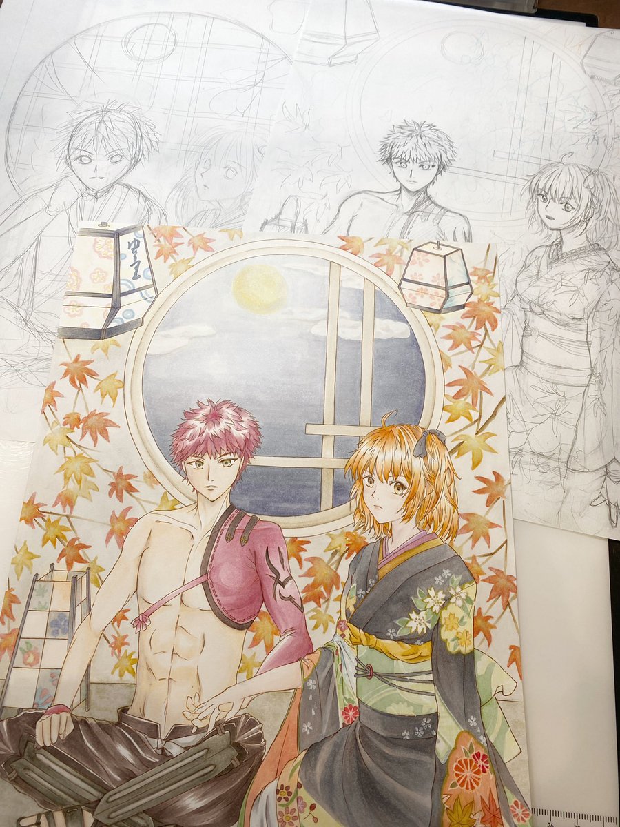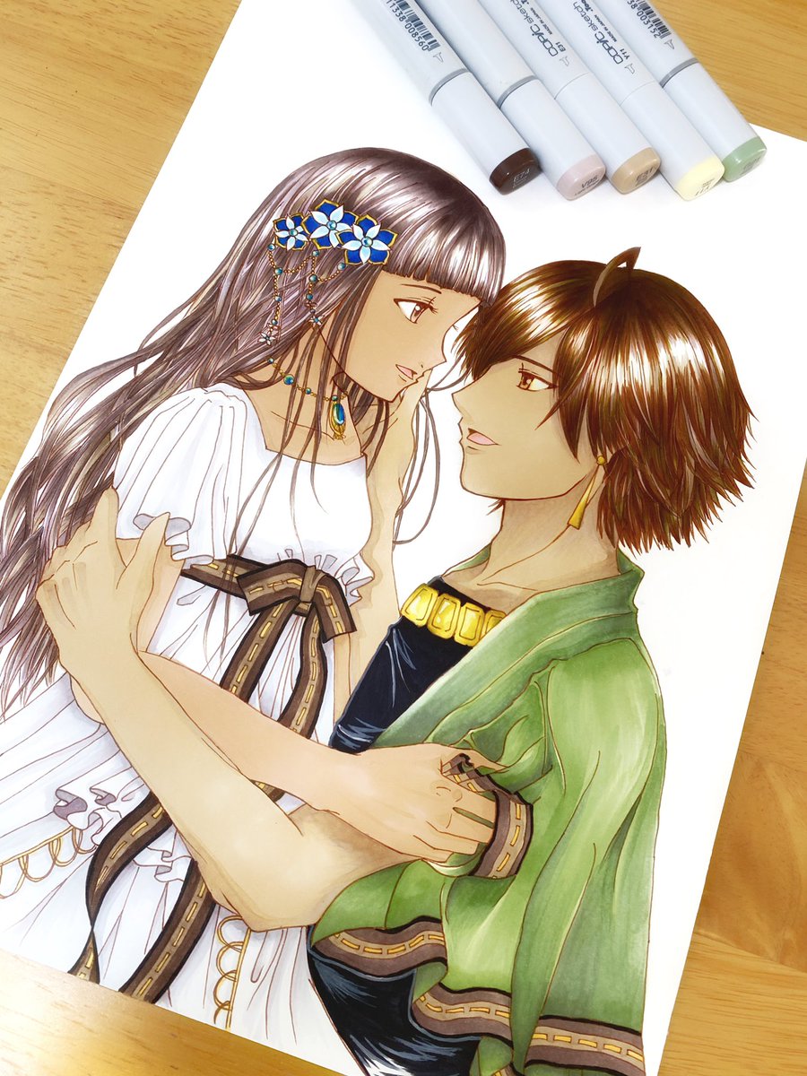 #コピック #アナログ 以前描いたオジネフェを微修正しつつ、塗り塗りしてみました。ファラオの羽織、やっぱ白だったかなーって思ったけど、まぁこれはこれで?🤔 twitter.com/yuuri_no333/…