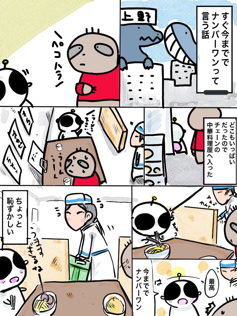 サイゼで喜ぶ彼女が話題ですが こちらはチェーンの中華料理店の400円のラーメンが世界一美味いと 喜ぶうちゅうじんです。 #創活 #ArtistOnTwitter #絵描きさんと繋がりたい #一次創作 #一次 因みにサイゼでは間違い探しを解るまでやります。