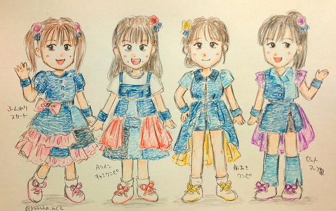 福山はデニムの生産量日本一✨ということで、デニムを基調した衣装があるかなと勝手に想像してみたり👗(勢いで描いたので色々雑なのは見逃してね…😅) #福山市 #ももクロ春一 #春の一大事2023 #momoclo_fanart