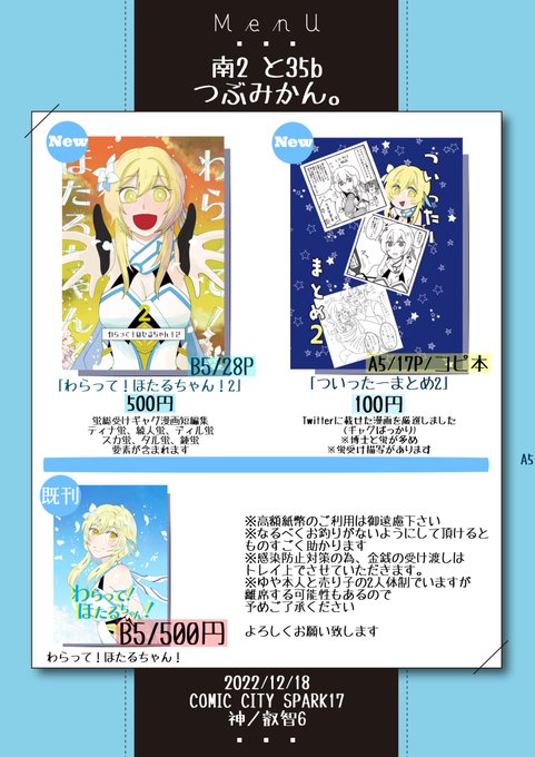 2022/12/18 COMIC CITY SPARK 17 神ノ叡智 6 【南2 と35b】つぶみかん。 お品書きと新刊サンプルくっつけました! 全て蛍総受けとなります。 会場でお会い出来るのを楽しみにしております! 新刊既刊は通販でも頒布予定なのでお取り置きなどあれば気軽にリプなどでお声がけ下さい!
