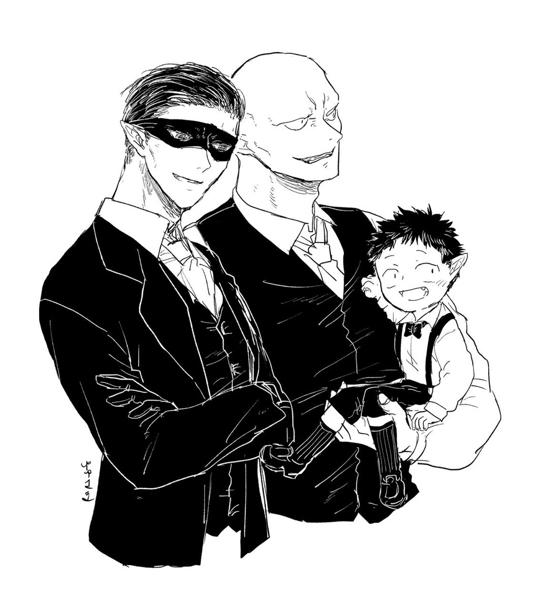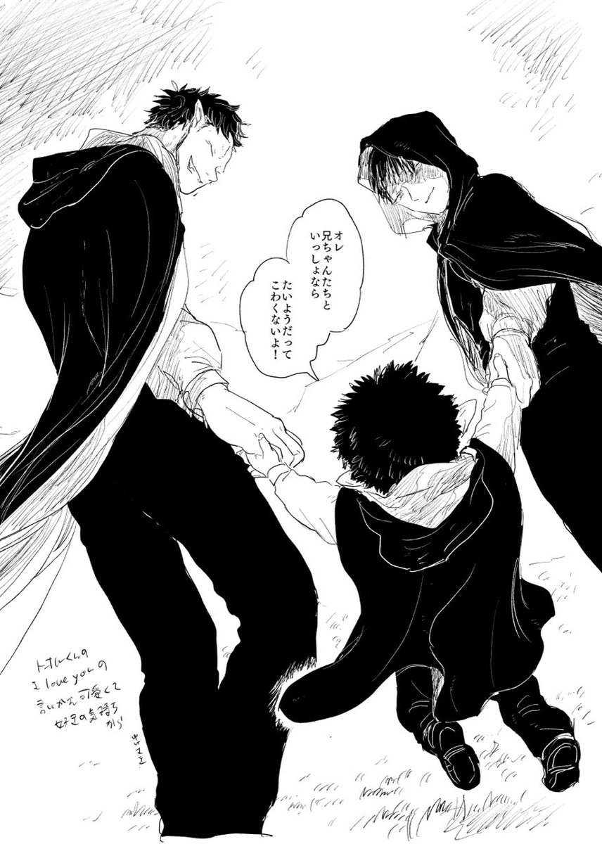 31 199 19巻の三兄弟回のアイラブユー翻訳のやつを、更に言い換えた?感じというか、👻くんのと✊兄のでふわっと浮かんだので描いた感じというか、せっかくなら👙ちゃんも…って思ったけど難しかった 22/11/20 08:21