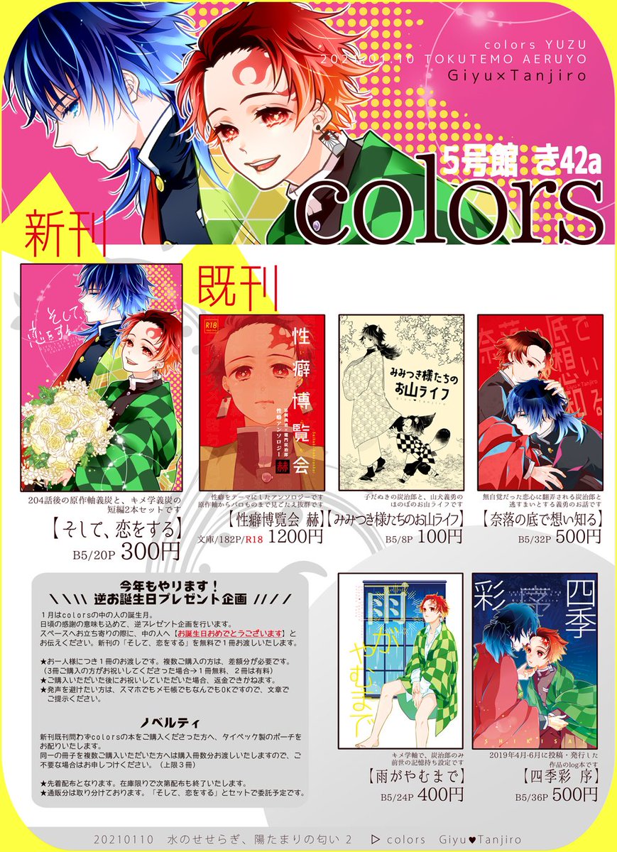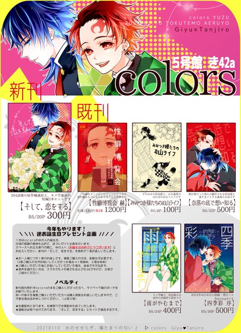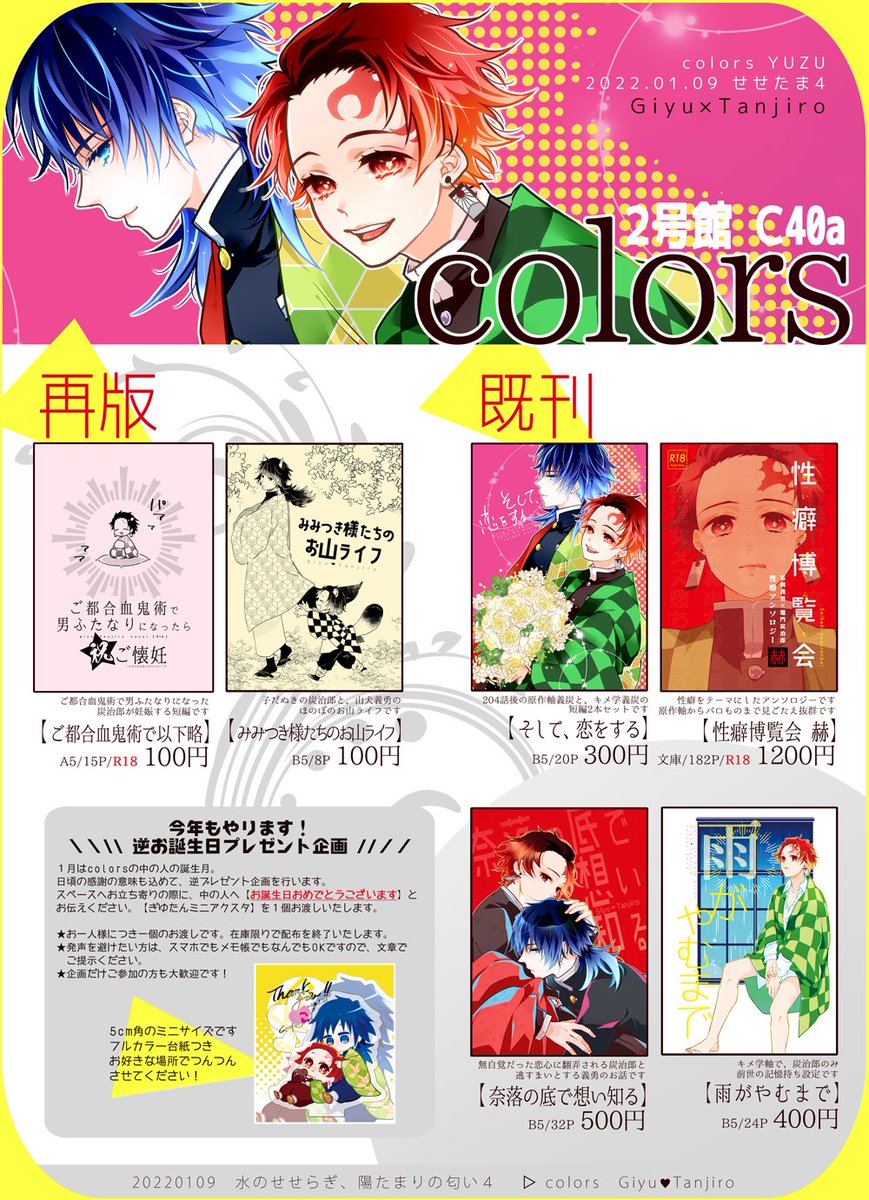 20 68 1/9開催のせせたまのお知らせです。 配置情報【 2号館 C40a colors 】 当日は義炭ペーパーラリー企画にも参加いたします! また、毎年恒例の逆お誕プレ企画も行います🥳✨ 詳細はリプツリーにてご確認ください。 ①再版タイトルについて ②既刊のお知らせ ③当日企画 ④取り置き詳細 22/01/04 19:21