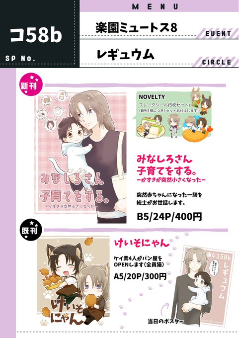 2/12楽園ミュートス8お品書きです。 東4 コ58b レギュウム イベント参加が約三年ぶりなので緊張しております…当日はどうぞよろしくお願いします!! pixiv.net/artworks/10526…