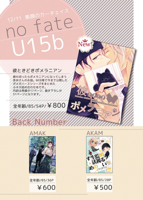 24 98 2/12の新刊のお知らせです 「彼ときどきポメラニアン 番外編」 B5/8P/100円 全年齢折本 ポメガバシリーズの短い続編です ペラ本のため当日頒布のみで通販はありません 代わりに後日WEB公開すると思うので、紙で欲しいorポスカラリーの発行物を集めたい人向けです🙇♂️ #真夜茶新刊 23/02/02 19:16