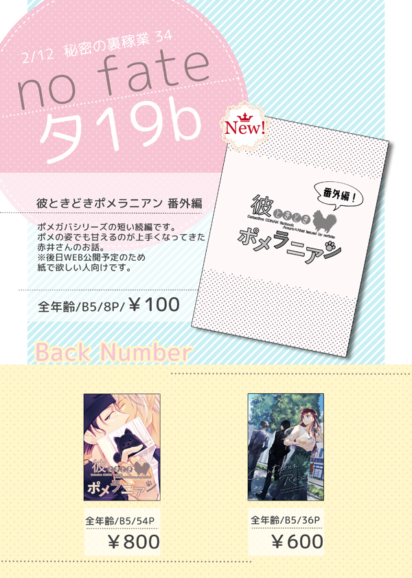 2/12の新刊のお知らせです 「彼ときどきポメラニアン 番外編」 B5/8P/100円 全年齢折本 ポメガバシリーズの短い続編です ペラ本のため当日頒布のみで通販はありません 代わりに後日WEB公開すると思うので、紙で欲しいorポスカラリーの発行物を集めたい人向けです🙇♂️ #真夜茶新刊