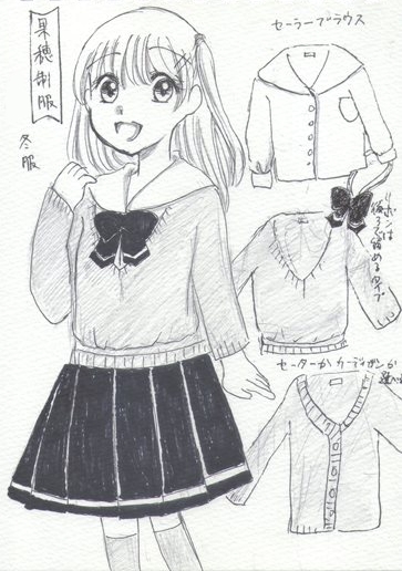 アイコンにしている果穂(オリキャラ)の制服、モノクロならこんな感じかなという絵です。落書きなのでセーターや影などのグレー部分は鉛筆で塗っています。 カラーで全身描いてるのは過去に描いたのくらいしかなかった・・・。