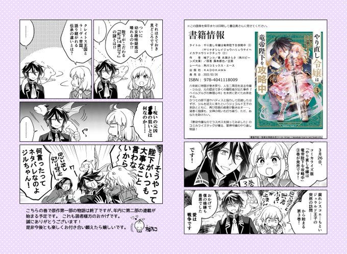 🌸お知らせ🌸 3/26、漫画版「やり直し令嬢は竜帝陛下を攻略中」③発売です。何卒よろしくお願いいたします🙇♀️ kadokawa.co.jp/product/322105… 雑誌未掲載のおまけは、どうしても入れたかったエピソードを許されるページ数ぎゅうぎゅうに詰め込んでみました。そちらも何とか読んで頂けると嬉しいです🥰