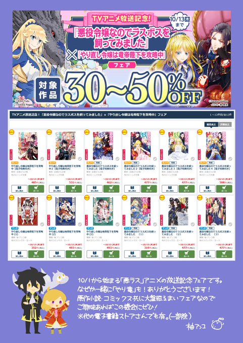 悪ラスアニメ記念で漫画も原作さんと共にフェアに入れて頂きました! 漫画版も最新刊までと、なかなか無いお得な機会だと思うので、ご興味ある方は是非🙇♀️ 「TVアニメ放送記念!『悪役令嬢なのでラスボスを飼ってみました』×『やり直し令嬢は竜帝陛下を攻略中』フェア」 bookwalker.jp/campaign/25463/