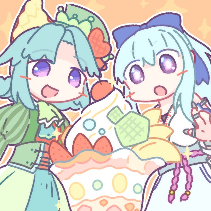 プレーナさんお誕生日おめでとうございます~!! お祝いとこの前の絵のお礼の気持ちも込めて、 合作フルーツパフェ完成!なワフリィ&フィーラちゃんを描いてみました😊 twitter.com/Pleana2/status…