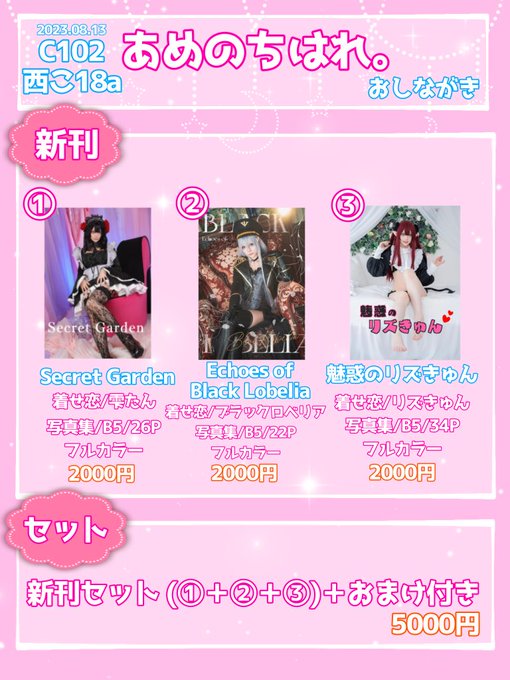 26 45 🍧夏コミのお品書き🍉 【新刊】 ①SecretGarden ②Echoes of Black Lobelia ③魅惑のリズきゅん 新刊3冊頑張ったので是非お手に取っていただきたいです!! ※お取り置きについてはALT参照 セットのおまけは当日のお楽しみです✨ 8/13(日)西こ18aにてお待ちしております☺️ #C102お品書き #c102 23/08/05 23:00