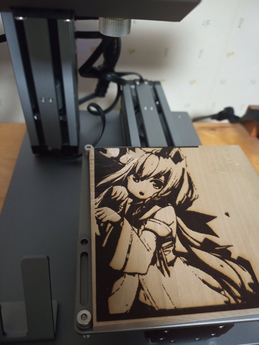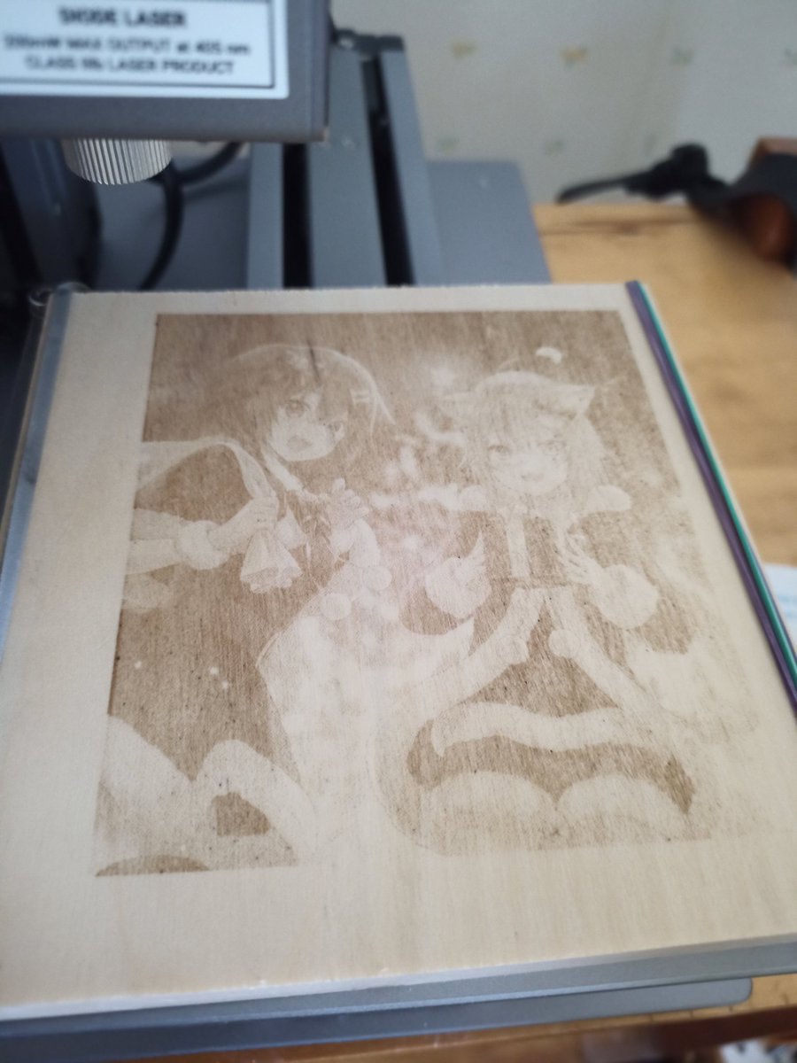 0 3 #snapmaker (Original 1.6wレーザー仕様) #フタツナフォニー #フォニイラ 出来たー 薄いけど許してください ※主は絵が書けません FAから拝借しています MDFだと薄くなるなぁ (設定変えるか) 22/04/22 20:36