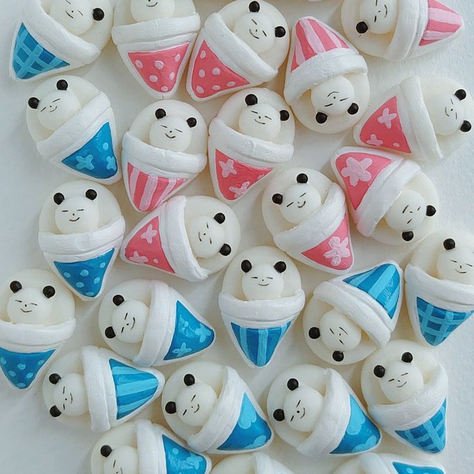 コラボブローチの仕上げ中ーー!! どれもめちゃくちゃ可愛いです🐼🐰🐻💕🌊 #100色のえのぐブローチ展 開催まであと 96日 @Lupopo_cafe twitter.com/yuzupanda_mura…