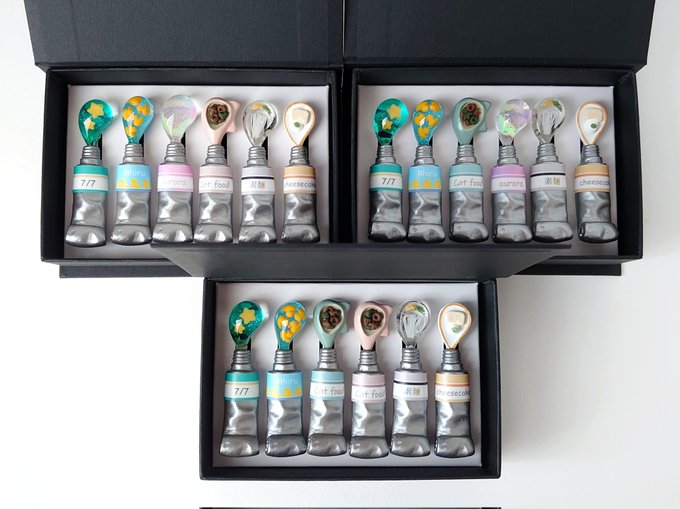 【新作 絵の具ブローチボックス🎨】 LUPOPOさんと言えばのチーズケーキをはじめ、新作ブローチをぎゅっと詰め込んだスペシャルボックスです!!アヒルちゃん5匹はボックス限定ブローチです🐼(3タイプあります) @Lupopo_cafe 個展詳細→yuzupanda.com/event/20230615…