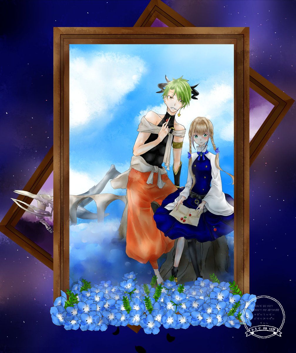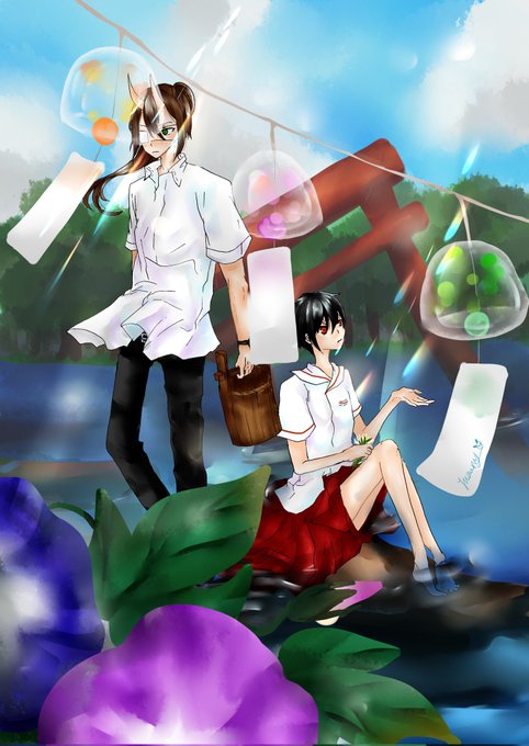 イチマツさんのタグ企画 #一次創作絵師拡散フェス03 に参加します!植物や水や角やら好きな物を詰め込んで描いてます( * . .)" 鬼の少年と短命の少女の話をゆるゆるマイペースにやってます୧😆و