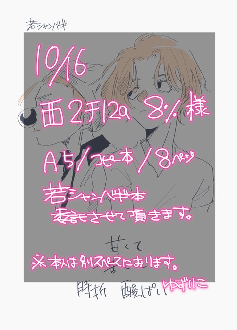 34 332 明日突発的に描いた、若シャンバギ本をあやさん(@a_ya_a_y_a )のスペースにて委託させて頂きます。 西2チ12a サークル名【8%】様です。 22/10/15 16:50