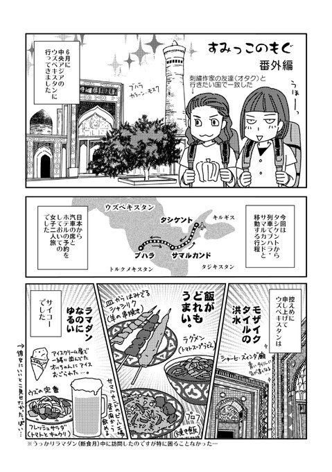 刺繍作家の友達とは旅行好きということで意気投合し一緒にウズベキスタンに行った仲でもあります。(これは私がコミティアに🦔サークルで参加してた時のペーパー漫画)刺繍やモザイクタイルに囲まれてとても生き生きしてました。