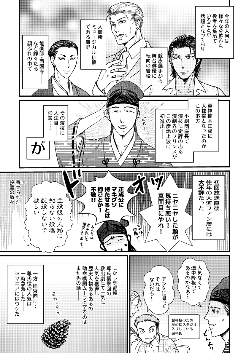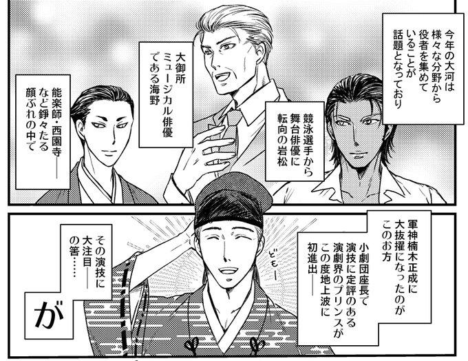 もしもngwkが大河ドラマだったら妄想漫画。 ※役者設定は実際の役者さんのバックグラウンドなども参考イメージとしてお借りしてるものもありますが全てその通りではない妄想です ※カプ要素はないですが推しカプ妄想が一緒の鍋で煮込まれていると思ってください🍲
