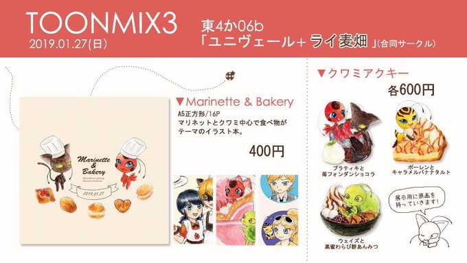 20 60 【TOONMIX3】🐞お品書き マリネットとクワミが中心の食べ物本と、クワミアクキーが出ます🍴 展示用に原画も持っていく予定です。よろしくお願いします✨ #TOONMIX3 19/01/21 21:35