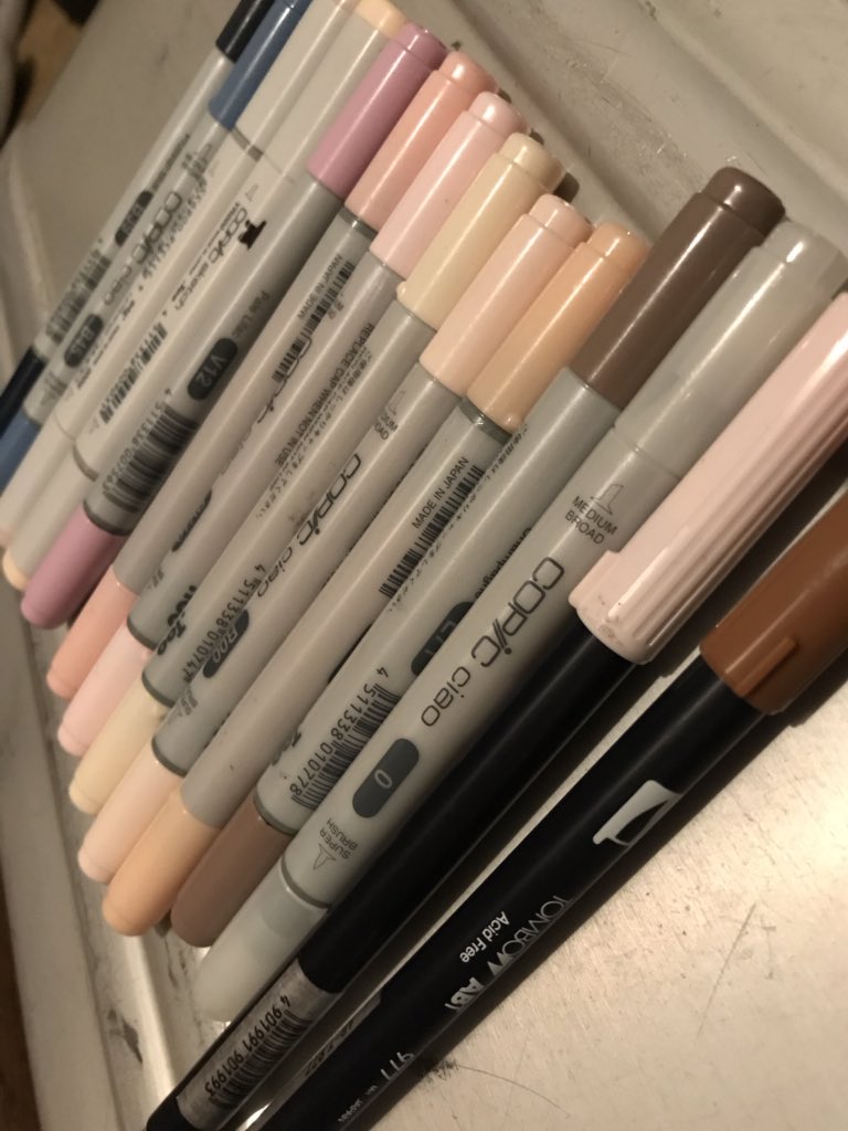 会社で長いこと眠ってたコピック持って帰ってきたんやけど… 塗り重なったとこが濃くなって縞模様になってしまうのをどうしたものか。。。デジ絵しか描いてこなかった僕に使えるんかコレ #コピック #コピックイラスト