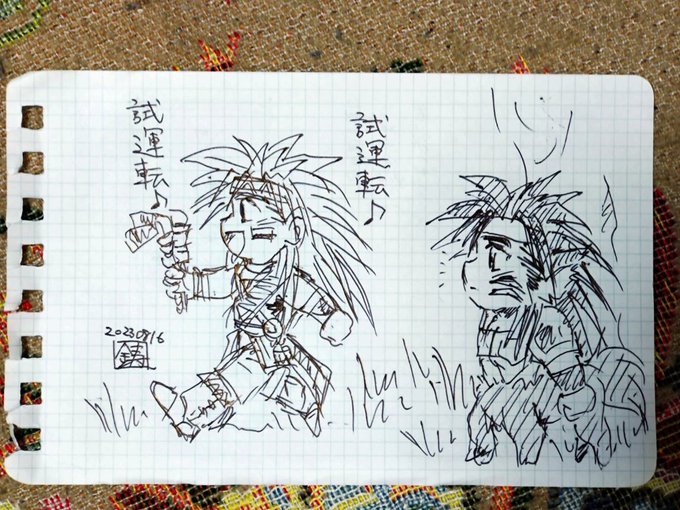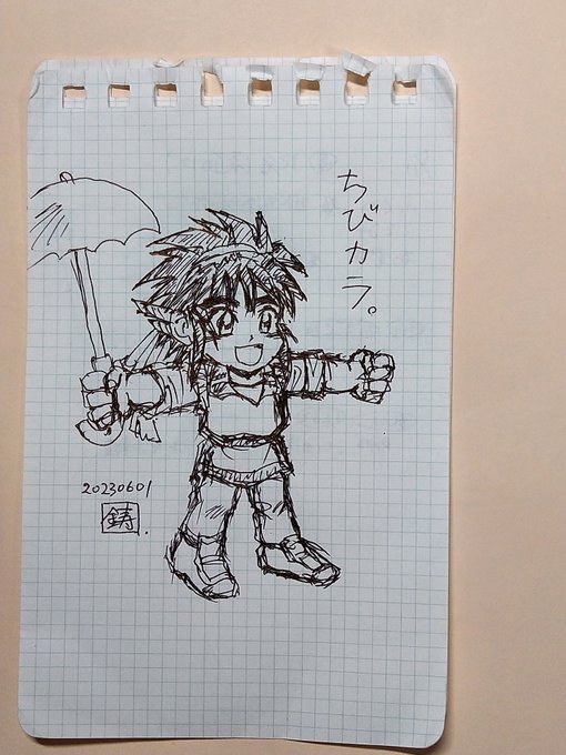 1 11 今日は休憩時間中に船漕がないでいられたので、コピー用紙を作り物で使った余りの切れ端にらくがきしました。 風車くんの自作武器が完成したようです。。。と言った感じでw 23/08/15 21:41