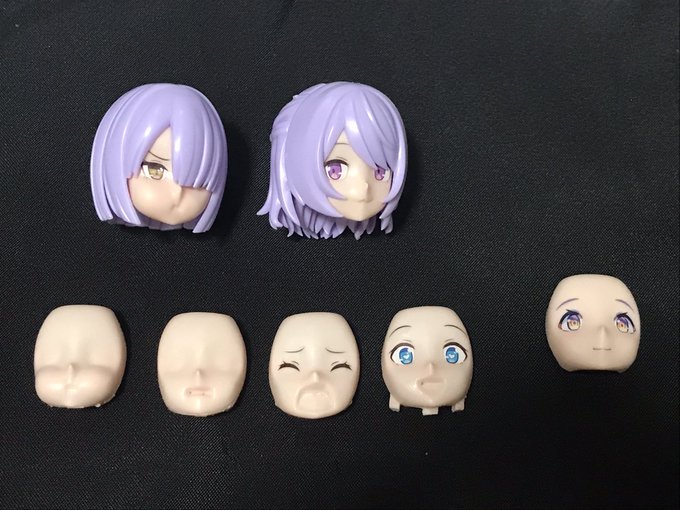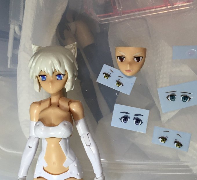 しまさんのBK用顔パーツ6種入りが着弾しました! 夜勤明けで寝る時間だったけど、遊びたくなるよね。😄 とりあえず手持ちのランサーとランチャーのデカール4つほど貼ってみた! めっちゃいい感じ❗️ 1番右は純正。色合い確認用に置いてみた。#メガミデバイス #コトブキヤ twitter.com/shima__takahir…
