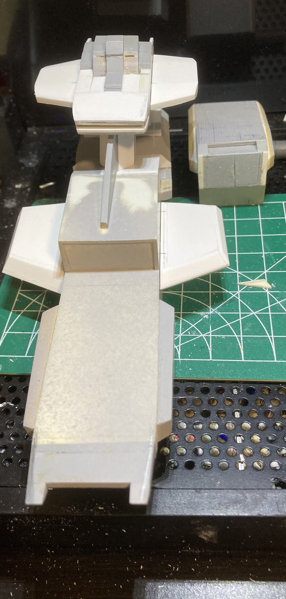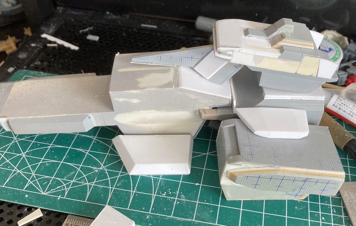 アレキサンドリア級の艦橋耳カタチ出してきたので穴開けてプラ棒で軸打ちして仮組みしてみた😊 なんとなくアレキサンドリアっぽい いつもなんとなくそれっぽい作風止まりだけど笑 アスワンにしよう迷いながら造ってたからカタパルト付近やら艦橋に残影が😅 #ガンプラの画像貼るとRTされると聞いて
