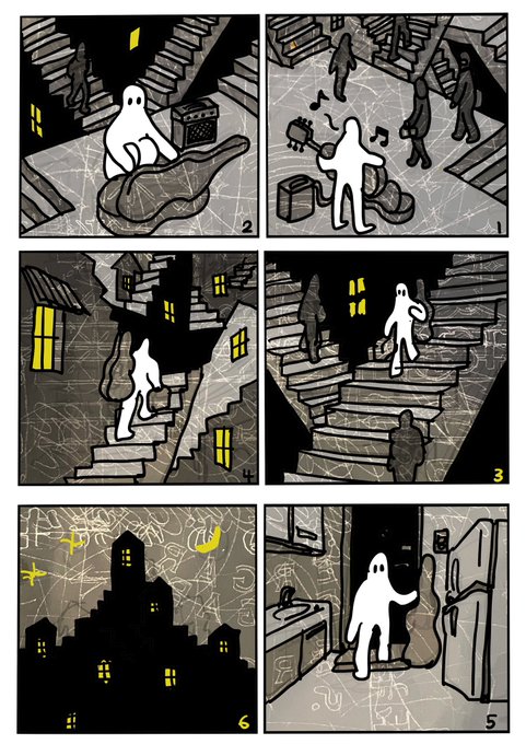 4 134 #コルクラボマンガ専科 #ホワイトマン ホワイトマンという白いキャラクターで「世界感」を表現する課題。「階段の街」を表現してみました〜 1時間くらいかかったかな。 22/02/25 00:09