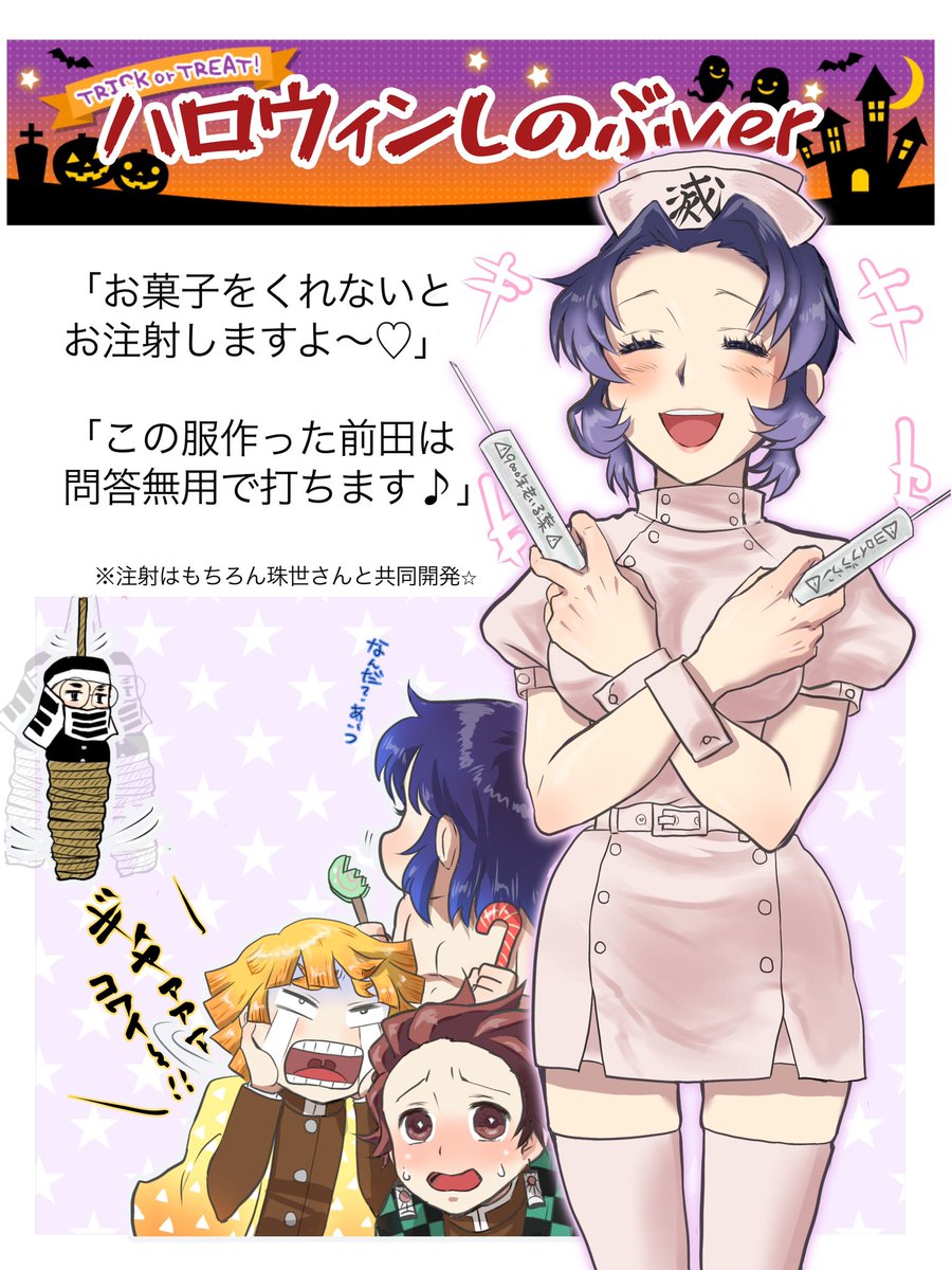 「胡蝶さんのナース服姿が見たかった(`-ω-´)✧キリッ」 と、前田は供述しており… 前田さんけっこう好きです笑 #鬼滅の刃イラスト #kmtハロウィンパーティー #胡蝶しのぶ #ハロウィンイラスト