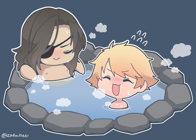 今日のみにキャラは温泉でまったりしてる狩雲霄くんと捲殘雲くんです。 寒い日は温かいお風呂が気持ちいいですね~ #サンファンアート