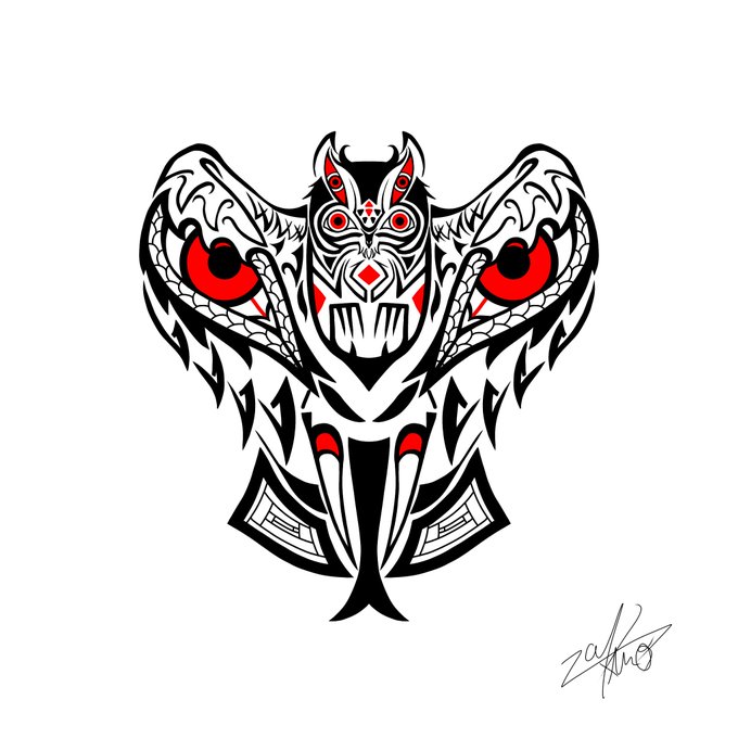 【ヘビフクロウ】 蓮の花を描こうとしてたのにフクロウになり、翼がヘビっぽくなったという謎の生き物。 トライバル……とは言わない気がする。ただの模様…? #イラスト好きな人と繋がりたい #イラスト