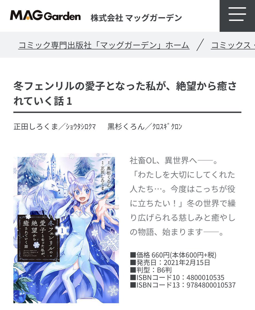 冬フェンリル本日発売です〜〜!よろしくお願いします(。>ㅅ<。) 社畜OLだった主人公が雪国で癒されていく話!一冊でもよくまとまっています。楽しんでいただけますように❄️🌸 #マッグガーデンノベルズ