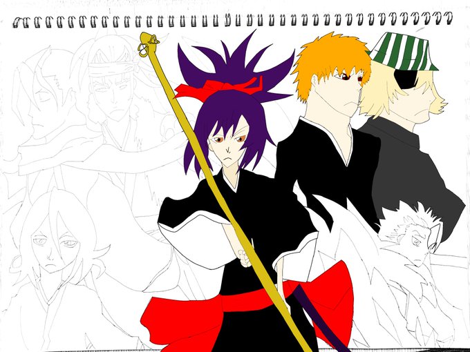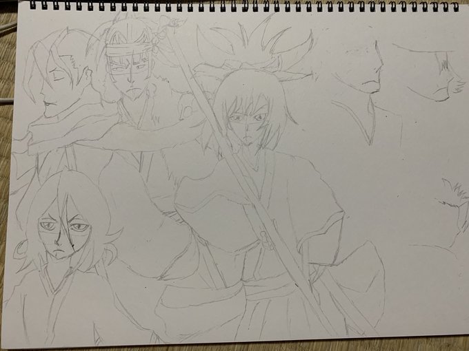 よし、まだ、制作中だけど 酷いラフ画ですまん! 茜雫は出来上がってる! #イラスト #BLEACH #黒崎一護 #茜雫 #浦原喜助 #日番谷冬獅郎 #阿散井恋次 #朽木白哉 #朽木ルキア
