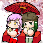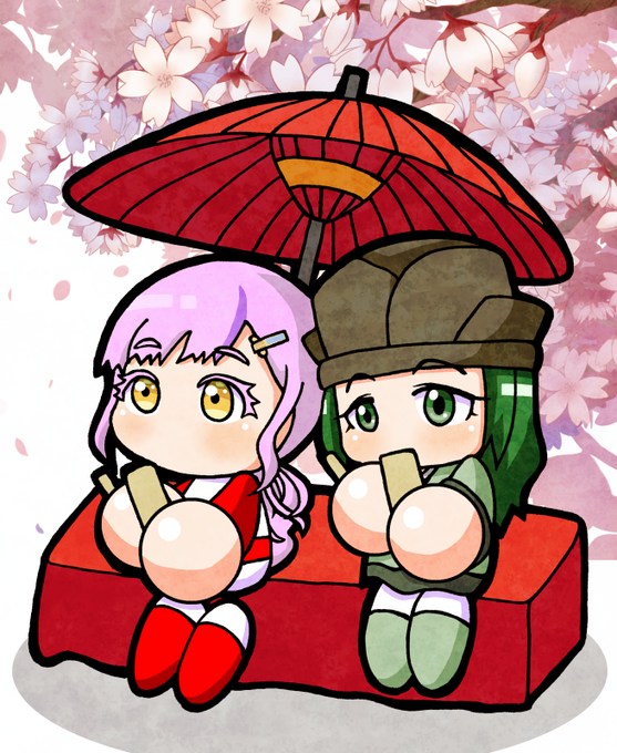 Amino-3さん(@Am_acid75)の百歌つむぎちゃんとあちってぃさん(@pawapocketty)の松尾葉郁さんを描かせていただきました! 雅な和歌コンビ、桜を見ながら野点で一句! #勝手にパワプロオリキャラファンアート