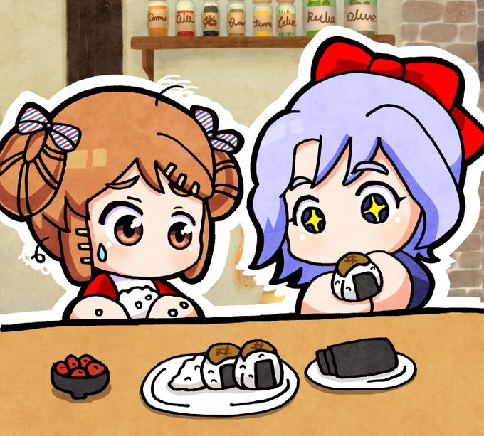 すいみさん(@mmr_suimmer)の膨田小麦ちゃんとAirさん(@ozone_99)の暗部楼図さんを描かせていただきました! 二人でおにぎり作りに挑戦! #勝手にパワプロオリキャラファンアート