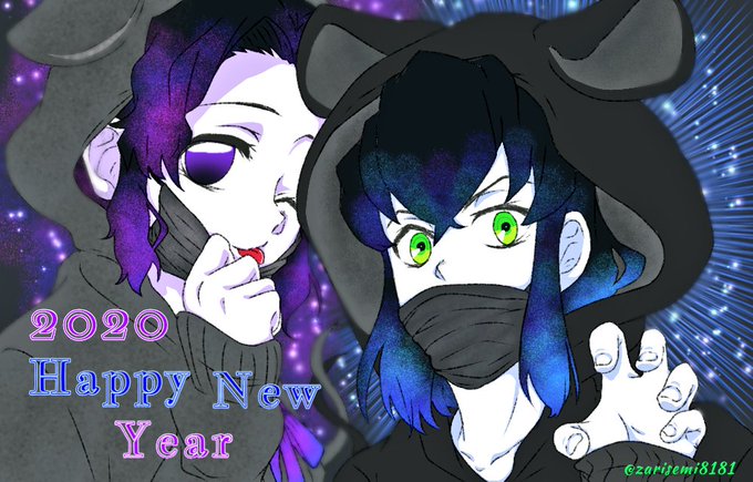 1 1 2020/描き初め しのぶさん🦋と伊之助くん 🐗 #鬼滅の刃イラスト 20/01/03 02:44