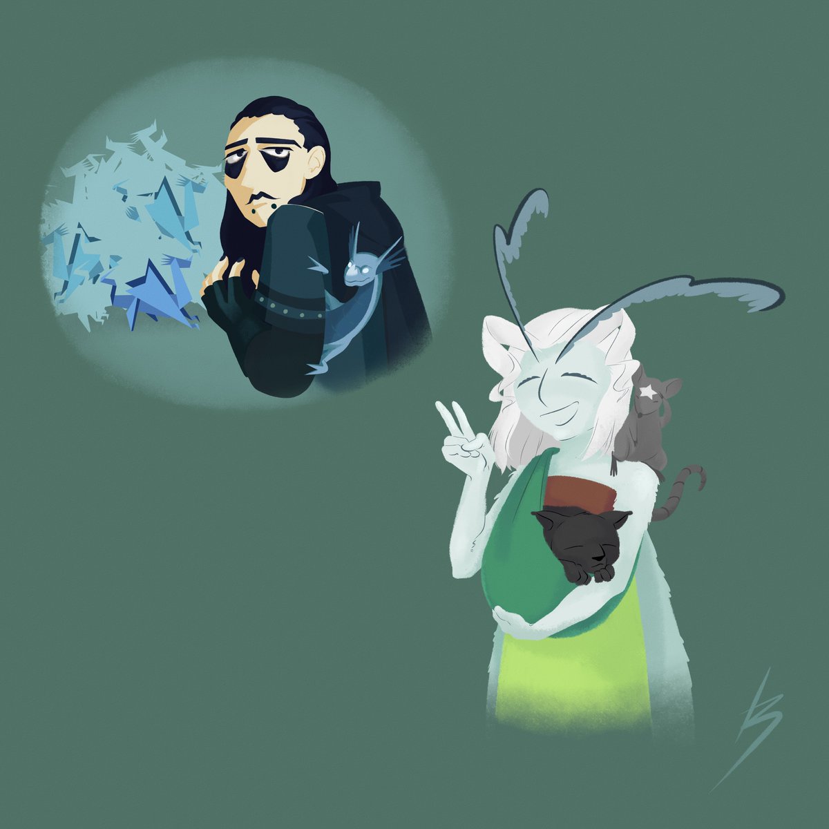 Meeting a new party member (mouse on shoulder) that joined later in the game. After an encounter my character Toto gives them a rundown on the others VERY objectively XD 1/6 Going to add about the other party members as well C: #DnD #ttrpg #digitalart #dndart #digitaldrawing