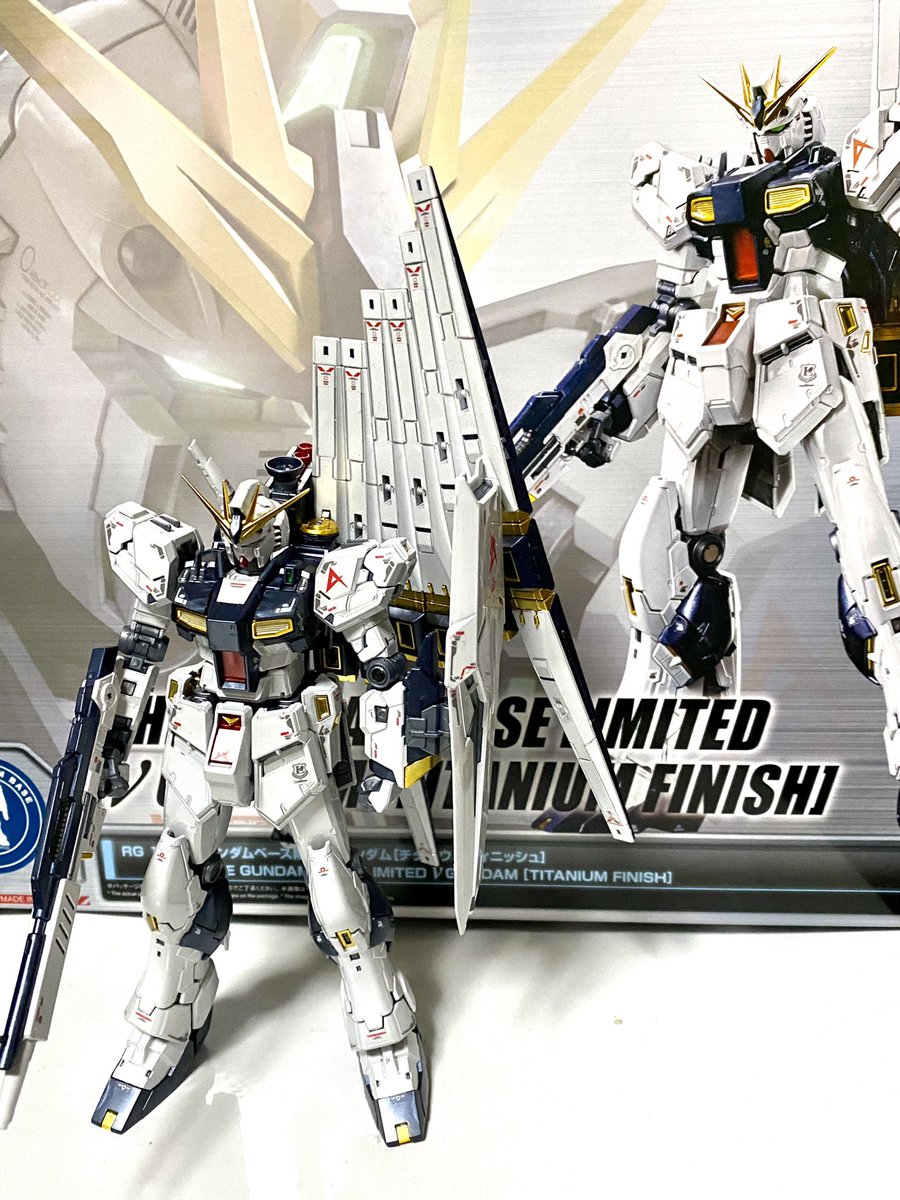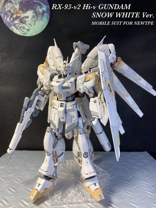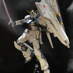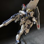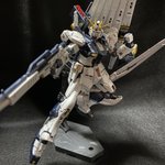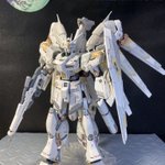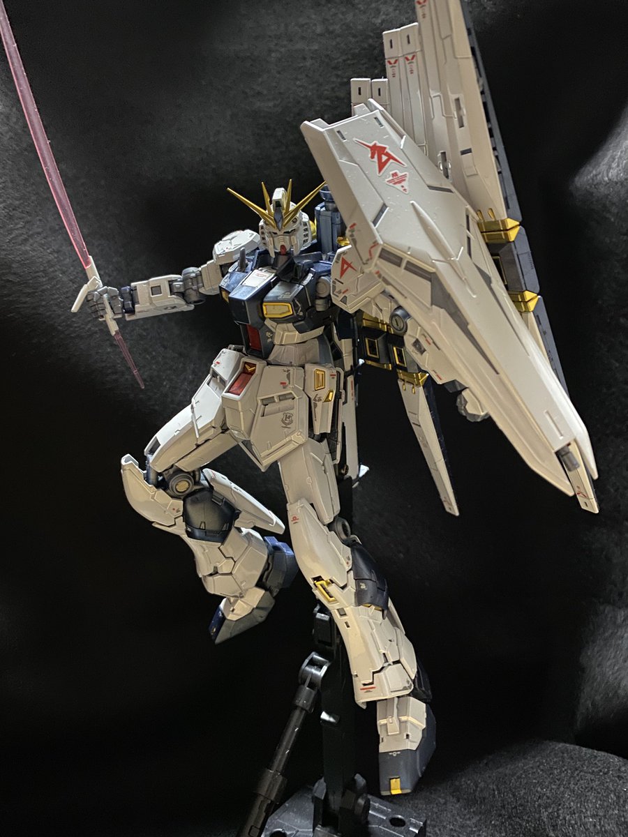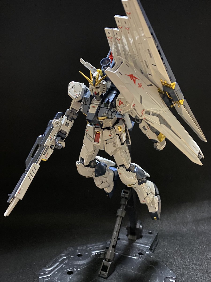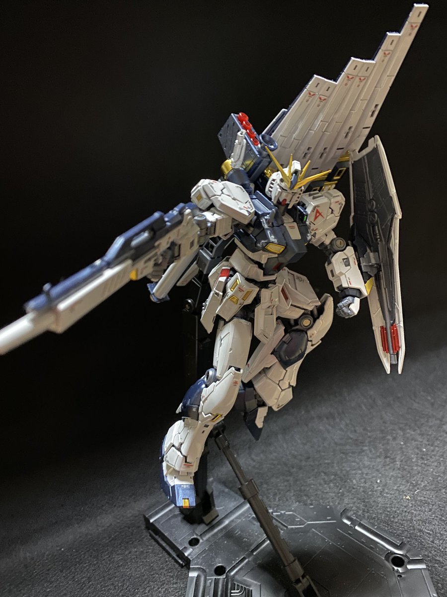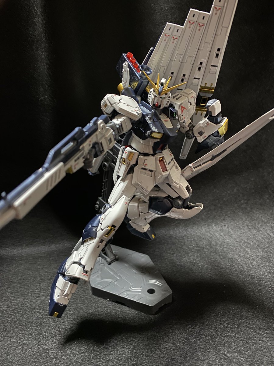 ベースを買ったので、ポーズを付けてみました。ポージングや照明等、改善点は多いものの、これはこれで惚れ惚れします(^^) #ガンプラ好きと繋がりたい #νガンダム #ガンプラの画像貼るとRTされると聞いて