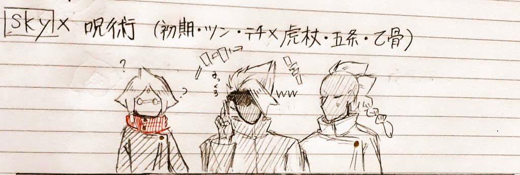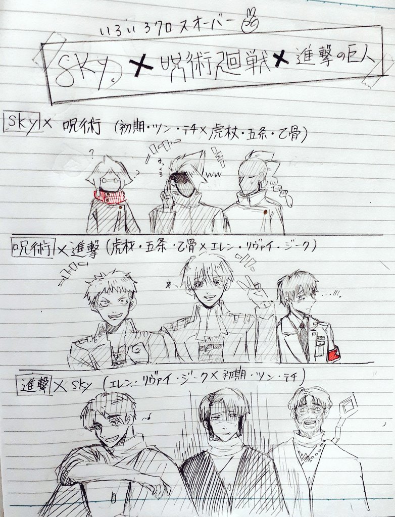 クロスオーバー Sky⇢初期、テチ、ツン 呪術⇢虎杖悠仁、五条悟、乙骨憂太 進撃⇢エレン、リヴァイ、ジーク #sky星を紡ぐ子どもたち #thatskygame #呪術廻戦 #呪術廻戦ファンアート #進撃の巨人