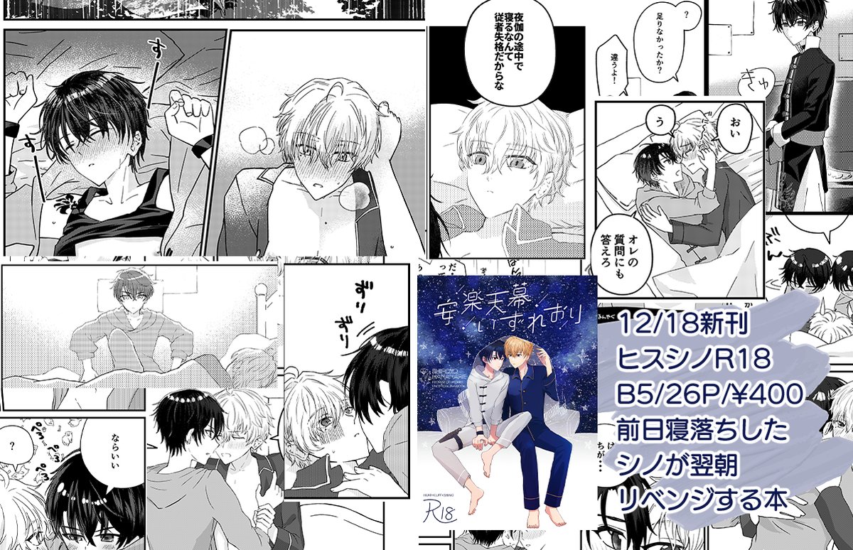 12/18 賢マナ10 南3ま05a城よ花なれ ヒスシノ新刊サンプル&品書き 新刊は寝間着のエロ本です! サンプル⇒pixiv.net/artworks/10361… 通販⇒ec.toranoana.jp/joshi_r/ec/ite… また、プチ開催にむけて新刊カードを集めてます! よろしくお願いします~