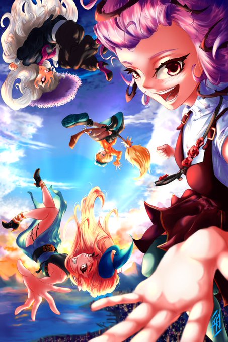 I had the awesome opportunity to work with the unofficial #Nijisanji fanzine, Rainbow Colored Skies! This was my contributing piece of our EN livers, Rosemi, Reimu, Pomu, and Millie, in custom designed outfits :D #GalleryOfRoses #PomuPaint #Reimural #DrawMillie